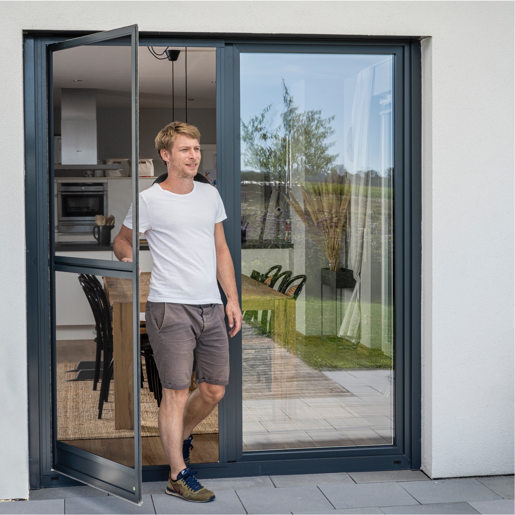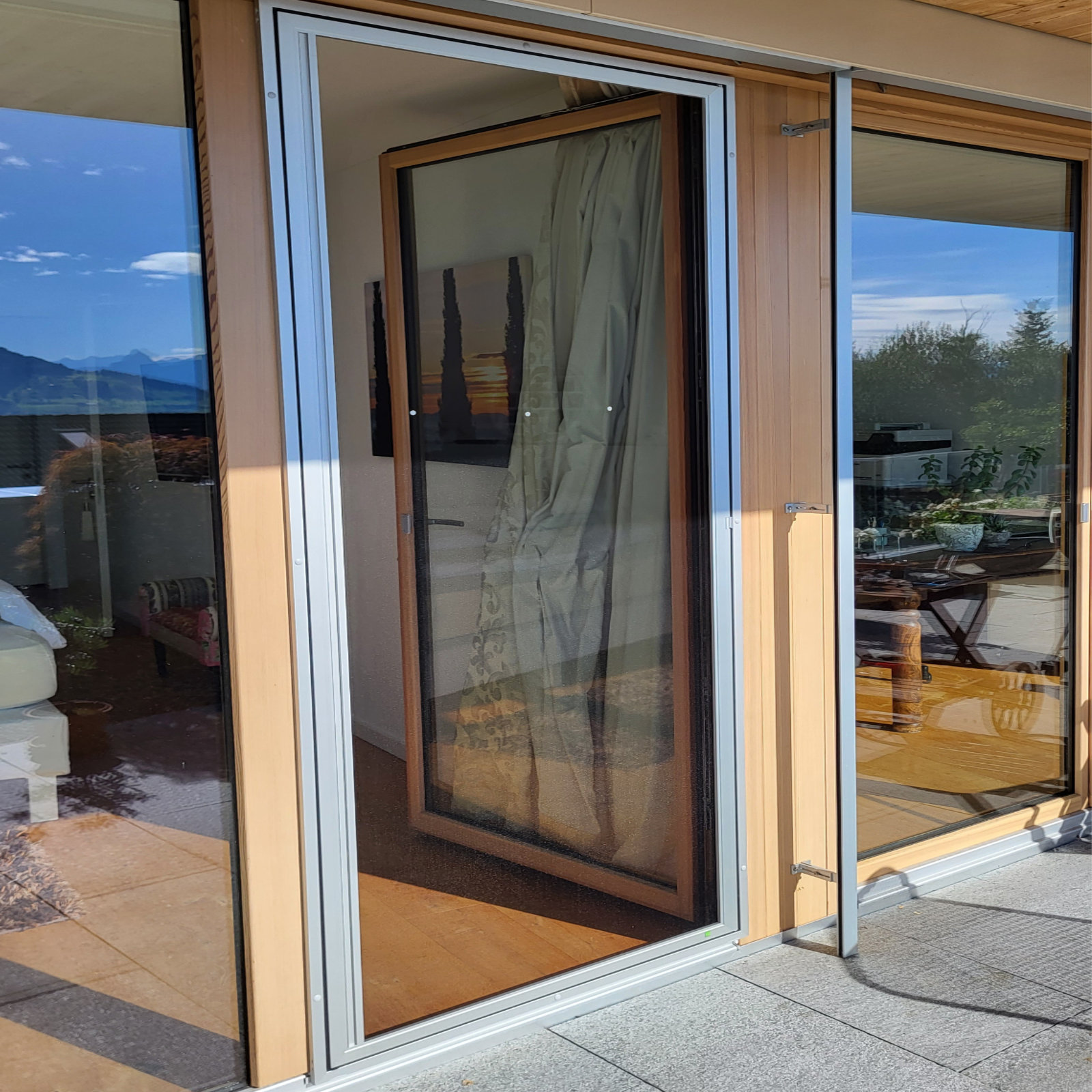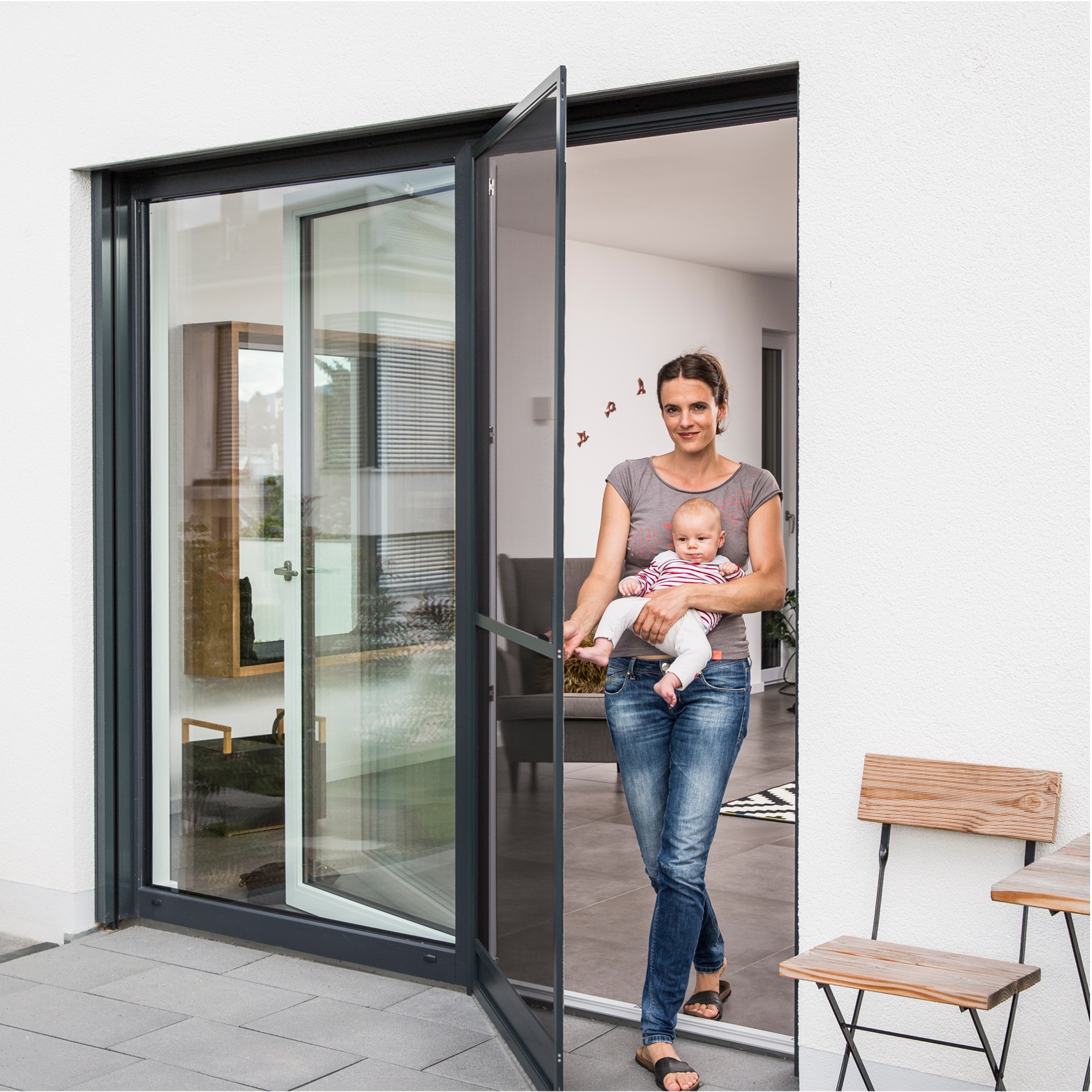 Eine Pendeltüre mit einem Insektenschutzgitter ist eine Alternative zur Drehtüre. Im Vergleich zur Drehtüre, die entweder nach aussen oder nach innen geöffnet werden kann, schwingt die Pendeltüre in beide Richtungen. Nach dem Öffnen, das auch mit einem leichten Fussdruck funktioniert, geht die Pendeltüre in die Ausgangsposition zurück und schliesst selbstständig. Eine Pendeltüre ist stabil und langlebig und passt fast in alle Türvarianten.