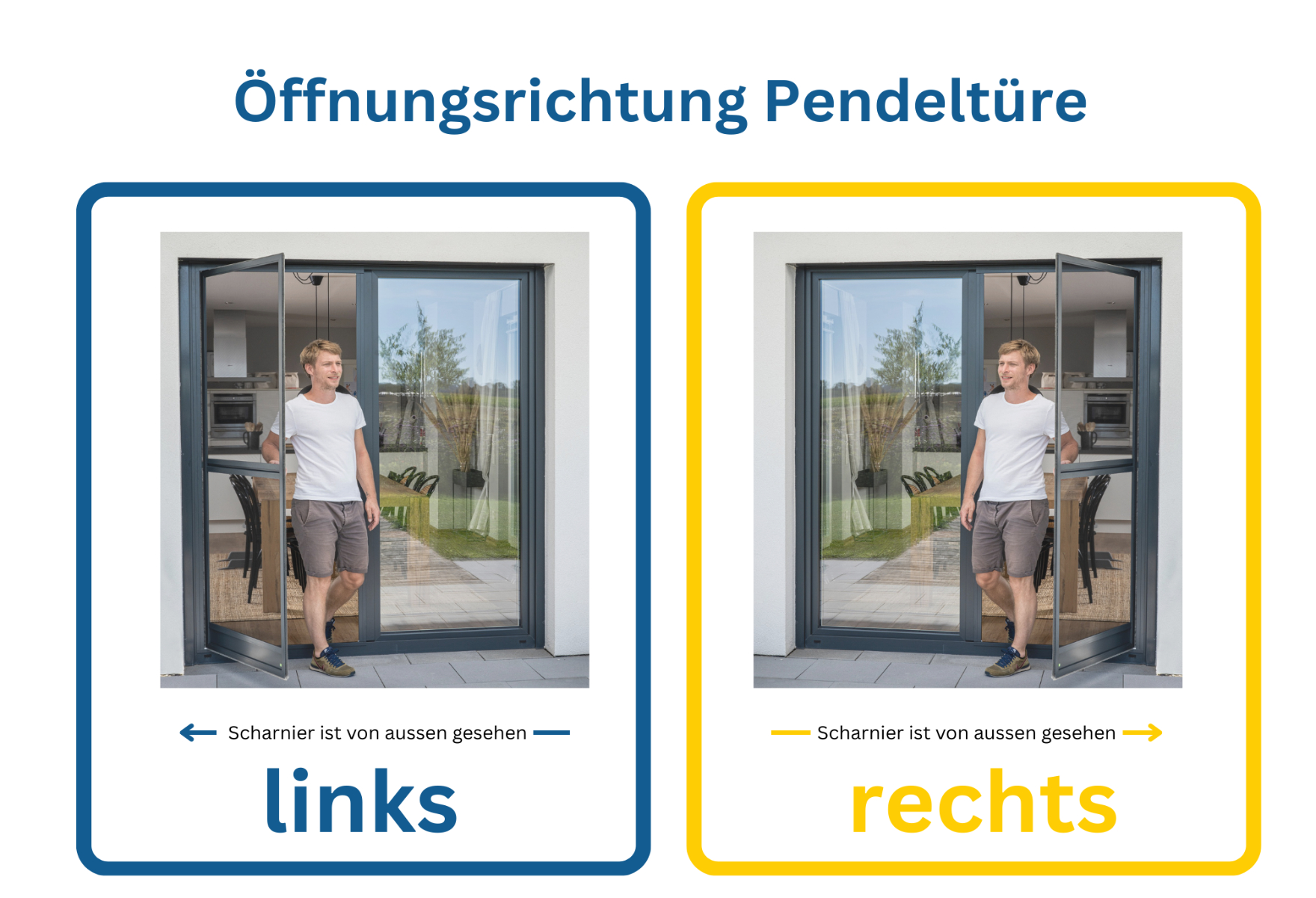 Bei der Bestellung von Insektenschutzgittern führt die Öffnungsrichtung immer wieder zu Verwirrung. Bei Pendeltüren wird die Öffnungsrichtung immer von aussen betrachtet – also von der Terrasse oder dem Balkon aus in Richtung Innenraum.