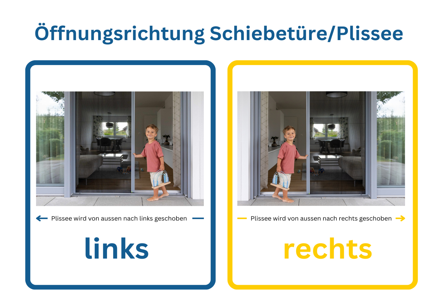 Bei der Bestellung von Insektenschutzgittern führt die Öffnungsrichtung immer wieder zu Verwirrung. Bei Schiebetüren wird die Öffnungsrichtung immer von aussen betrachtet – also von der Terrasse oder dem Balkon aus in Richtung Innenraum.
