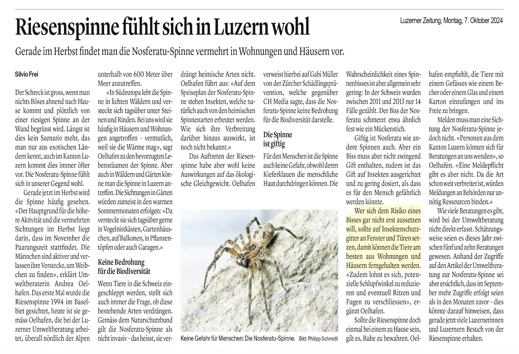 Insektenschutzgitter bieten den besten Schutz vor der Riesenspinne, die sich in unserer Region wohlfühlt. Warum die Nosfaratu-Spinne gerade im Herbst vermehrt in Wohnungen und Häusern auftaucht, erfahren Sie in diesem Artikel der Luzerner Zeitung vom 7. Oktober 2024.